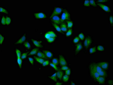 Immunofluorescence staining of Hela cells with CSB-PA618079LA01HU at 1:100, counter-stained with DAPI. The cells were fixed in 4% formaldehyde, permeabilized using 0.2% Triton X-100 and blocked in 10% normal Goat Serum. The cells were then incubated with the antibody overnight at 4°C. The secondary antibody was Alexa Fluor 488-congugated AffiniPure Goat Anti-Rabbit IgG(H+L).