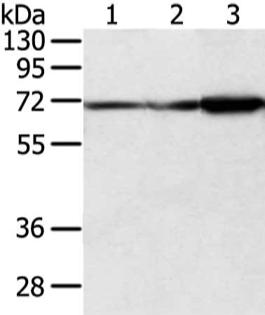 • Gel: 8%SDS-PAGE, Lysate: 40 μg, Lane 1-3: A431, hepg2 and lncap cell, Primary antibody: CSB-PA084734(DLAT Antibody) at dilution 1/800 dilution, Secondary antibody: Goat anti rabbit IgG at 1/8000 dilution, Exposure time: 3 seconds