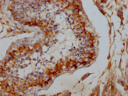 IHC image of CSB-PA006938LA01HU diluted at 1:100 and staining in paraffin-embedded human testis tissue performed on a Leica BondTM system. After dewaxing and hydration, antigen retrieval was mediated by high pressure in a citrate buffer (pH 6.0). Section was blocked with 10% normal goat serum 30min at RT. Then primary antibody (1% BSA) was incubated at 4°C overnight. The primary is detected by a Goat anti-rabbit IgG labeled by HRP and visualized using 0.05% DAB.