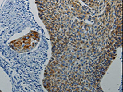 • The image on the left is immunohistochemistry of paraffin-embedded Human cervical cancer tissue using CSB-PA695604(DRD4 Antibody) at dilution 1/5, on the right is treated with synthetic peptide. (Original magnification: ×200)