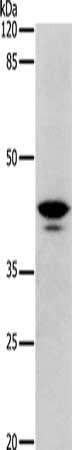 • Gel: 10%SDS-PAGE, Lysate: 30 μg, Lane: Mouse skeletal muscle tissue, Primary antibody: CSB-PA695604(DRD4 Antibody) at dilution 1/350, Secondary antibody: Goat anti rabbit IgG at 1/8000 dilution, Exposure time: 1 minute