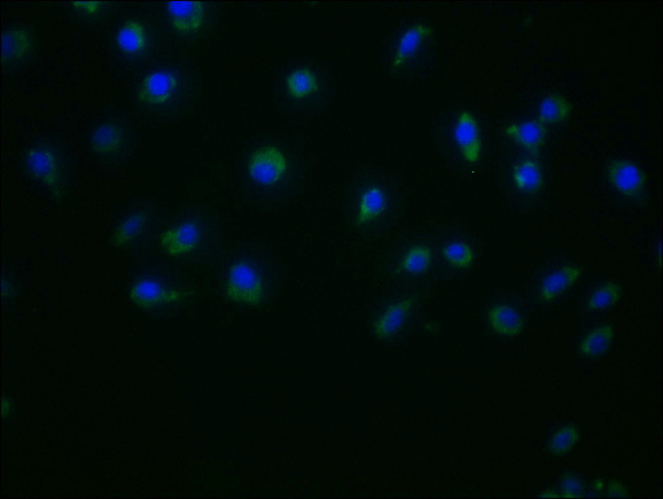 Immunofluorescence staining of Jurkat cells with CSB-PA007229ESR1HU at 1:50, counter-stained with DAPI. The cells were fixed in 4% formaldehyde and blocked in 10% normal Goat Serum. The cells were incubated with the antibody overnight at 4°C. Nuclear DNA was labeled in blue with DAPI. The secondary antibody was FITC-conjugated AffiniPure Goat Anti-Rabbit IgG (H+L).
