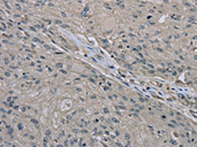 The image on the left is immunohistochemistry of paraffin-embedded Human esophagus cancer tissue using CSB-PA198612(EDN1 Antibody) at dilution 1/30, on the right is treated with fusion protein. (Original magnification: ×200)