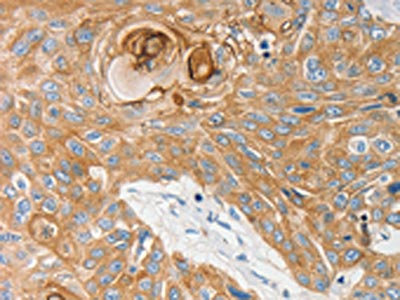 • The image on the left is immunohistochemistry of paraffin-embedded Human cervical cancer tissue using CSB-PA937611(EDNRB Antibody) at dilution 1/30, on the right is treated with synthetic peptide. (Original magnification: ×200)
