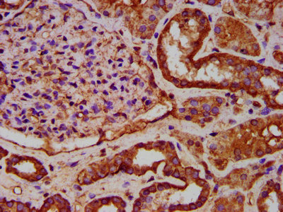IHC image of CSB-PA011571LA01HU diluted at 1:600 and staining in paraffin-embedded human kidney tissue performed on a Leica BondTM system. After dewaxing and hydration, antigen retrieval was mediated by high pressure in a citrate buffer (pH 6.0). Section was blocked with 10% normal goat serum 30min at RT. Then primary antibody (1% BSA) was incubated at 4°C overnight. The primary is detected by a biotinylated secondary antibody and visualized using an HRP conjugated SP system.