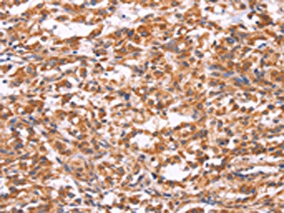 The image on the left is immunohistochemistry of paraffin-embedded Human ovarian cancer tissue using CSB-PA447792(EMP2 Antibody) at dilution 1/30, on the right is treated with synthetic peptide. (Original magnification: ×200)