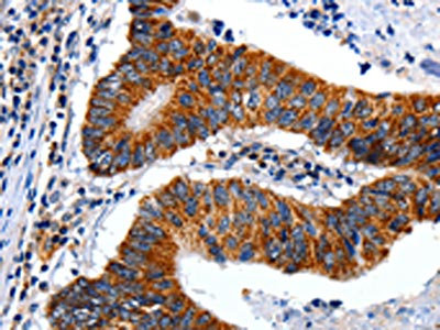 The image on the left is immunohistochemistry of paraffin-embedded Human colon cancer tissue using CSB-PA448237(ENPP3 Antibody) at dilution 1/15, on the right is treated with synthetic peptide. (Original magnification: ×200)
