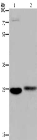 • Gel: 8%SDS-PAGE, Lysate: 40 μg, Lane 1-2: Mouse brain tissue, human fetal muscle tissue, Primary antibody: CSB-PA283664(EPDR1 Antibody) at dilution 1/250, Secondary antibody: Goat anti rabbit IgG at 1/8000 dilution, Exposure time: 20 seconds