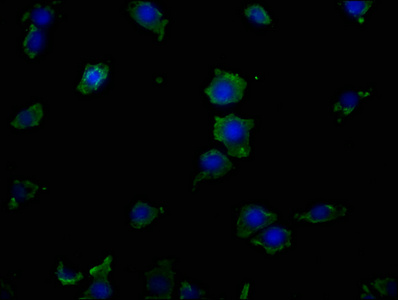 Immunofluorescence staining of SH-SY5Y cells with CSB-PA007728LA01HU at 1:50, counter-stained with DAPI. The cells were fixed in 4% formaldehyde, permeabilized using 0.2% Triton X-100 and blocked in 10% normal Goat Serum. The cells were then incubated with the antibody overnight at 4°C. The secondary antibody was Alexa Fluor 488-congugated AffiniPure Goat Anti-Rabbit IgG(H+L).