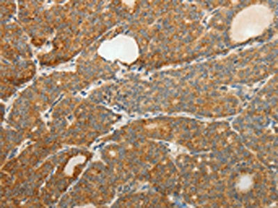 The image on the left is immunohistochemistry of paraffin-embedded Human thyroid cancer tissue using CSB-PA981490(F3 Antibody) at dilution 1/20, on the right is treated with fusion protein. (Original magnification: ×200)