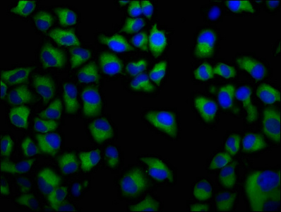 • Immunofluorescence staining of Hela cells with CSB-PA853494LA01HU at 1:133, counter-stained with DAPI. The cells were fixed in 4% formaldehyde, permeabilized using 0.2% Triton X-100 and blocked in 10% normal Goat Serum. The cells were then incubated with the antibody overnight at 4°C. The secondary antibody was Alexa Fluor 488-congugated AffiniPure Goat Anti-Rabbit IgG(H+L).