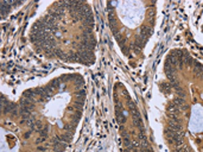 The image on the left is immunohistochemistry of paraffin-embedded Human colon cancer tissue using CSB-PA926721(FGFRL1 Antibody) at dilution 1/20, on the right is treated with fusion protein. (Original magnification: ×200)