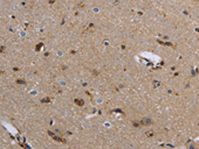 The image on the left is immunohistochemistry of paraffin-embedded Human brain tissue using CSB-PA197834(FIS1 Antibody) at dilution 1/20. (Original magnification: ×200)