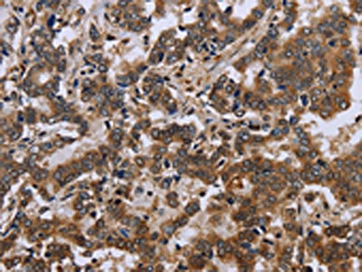 • The image on the left is immunohistochemistry of paraffin-embedded Human liver cancer tissue using CSB-PA952632(FMR1 Antibody) at dilution 1/30, on the right is treated with fusion protein. (Original magnification: ×200)