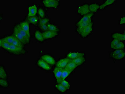 • Immunofluorescent analysis of HepG2 cells using CSB-PA11409A0Rb at dilution of 1:100 and Alexa Fluor 488-congugated AffiniPure Goat Anti-Rabbit IgG(H+L)