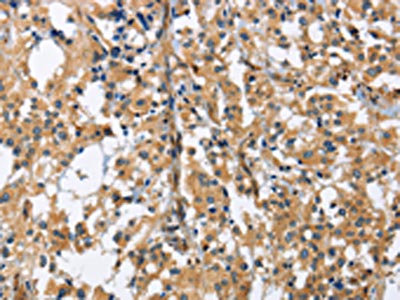 The image on the left is immunohistochemistry of paraffin-embedded Human thyroid cancer tissue using CSB-PA078640(GAB1 Antibody) at dilution 1/40, on the right is treated with fusion protein. (Original magnification: ×200)