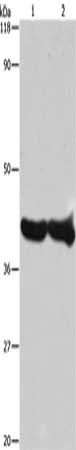 Gel: 8%SDS-PAGE, Lysate: 20 μg, Lane 1-2: 293T cells, Hela cells, Primary antibody: CSB-PA779821(GAPDH Antibody) at dilution 1/1000, Secondary antibody: Goat anti rabbit IgG at 1/8000 dilution, Exposure time: 15 seconds