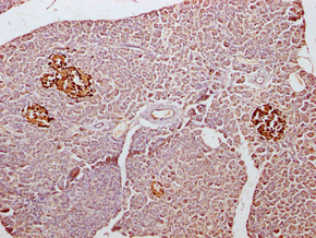 IHC image of CSB-PA009315LA11HU diluted at 1:300 and staining in paraffin-embedded human pancreatic tissue performed on a Leica BondTM system. After dewaxing and hydration, antigen retrieval was mediated by high pressure in a citrate buffer (pH 6.0). Section was blocked with 10% normal goat serum 30min at RT. Then primary antibody (1% BSA) was incubated at 4°C overnight. The primary is detected by a Goat anti-rabbit polymer IgG labeled by HRP and visualized using 0.05% DAB.