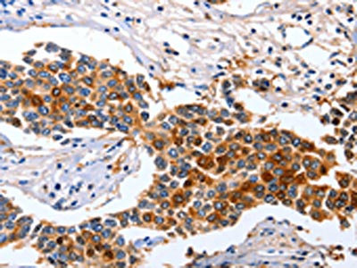 The image on the left is immunohistochemistry of paraffin-embedded Human breast cancer tissue using CSB-PA183839(GFER Antibody) at dilution 1/50, on the right is treated with fusion protein. (Original magnification: ×200)