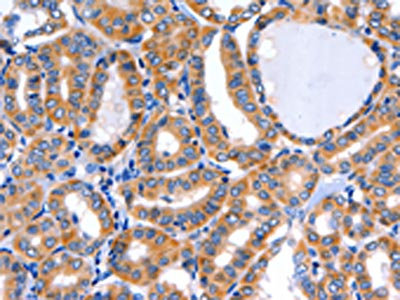 The image on the left is immunohistochemistry of paraffin-embedded Human thyroid cancer tissue using CSB-PA183839(GFER Antibody) at dilution 1/50, on the right is treated with fusion protein. (Original magnification: ×200)
