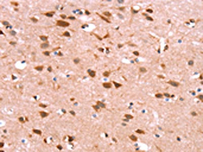 • The image on the left is immunohistochemistry of paraffin-embedded Human brain tissue using CSB-PA576969(GH1 Antibody) at dilution 1/40, on the right is treated with synthetic peptide. (Original magnification: ×200)