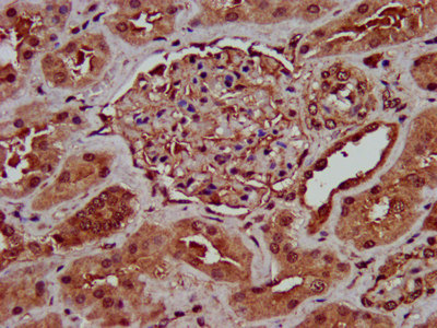 IHC image of CSB-PA617926LA01HU diluted at 1:400 and staining in paraffin-embedded human kidney tissue performed on a Leica BondTM system. After dewaxing and hydration, antigen retrieval was mediated by high pressure in a citrate buffer (pH 6.0). Section was blocked with 10% normal goat serum 30min at RT. Then primary antibody (1% BSA) was incubated at 4°C overnight. The primary is detected by a biotinylated secondary antibody and visualized using an HRP conjugated SP system.