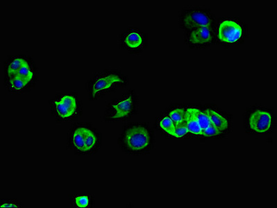 Immunofluorescent analysis of MCF-7 cells using CSB-PA009452LA01HU at dilution of 1:100 and Alexa Fluor 488-congugated AffiniPure Goat Anti-Rabbit IgG(H+L)