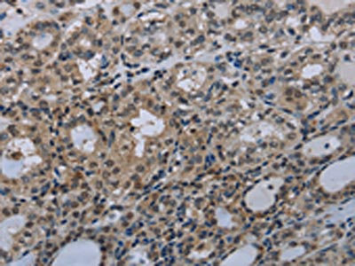 The image on the left is immunohistochemistry of paraffin-embedded Human thyroid cancer tissue using CSB-PA065045(GJC2 Antibody) at dilution 1/40, on the right is treated with synthetic peptide. (Original magnification: ×200)