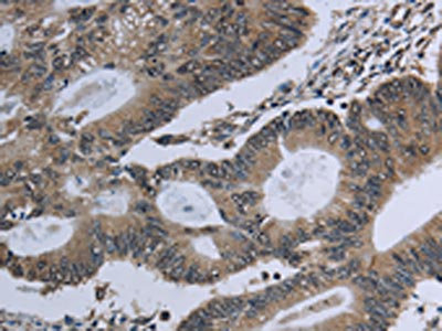 • The image on the left is immunohistochemistry of paraffin-embedded Human colon cancer tissue using CSB-PA234599(GNG2 Antibody) at dilution 1/60, on the right is treated with fusion protein. (Original magnification: ×200)