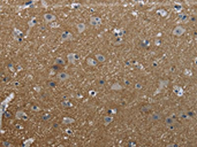 The image on the left is immunohistochemistry of paraffin-embedded Human brain tissue using CSB-PA164096(GNG2 Antibody) at dilution 1/50, on the right is treated with fusion protein. (Original magnification: ×200)