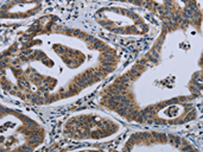 The image on the left is immunohistochemistry of paraffin-embedded Human gastic cancer tissue using CSB-PA164096(GNG2 Antibody) at dilution 1/50, on the right is treated with fusion protein. (Original magnification: ×200)