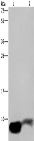 Gel: 10%SDS-PAGE, Lysate: 40 μg, Lane 1-2: Human fetal brain tissue, mouse brain tissue, Primary antibody: CSB-PA164096(GNG2 Antibody) at dilution 1/350, Secondary antibody: Goat anti rabbit IgG at 1/8000 dilution, Exposure time: 2 minutes