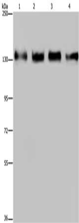 Gel: 6%SDS-PAGE, Lysate: 40 μg, Lane 1-4: 293T cells, Hela cells, A172 cells, A549 cells, Primary antibody: CSB-PA278921(GOLGA2 Antibody) at dilution 1/300, Secondary antibody: Goat anti rabbit IgG at 1/8000 dilution, Exposure time: 10 seconds