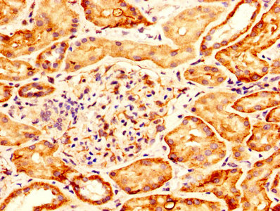 IHC image of CSB-PA009708LA01HU diluted at 1:300 and staining in paraffin-embedded human kidney tissue performed on a Leica BondTM system. After dewaxing and hydration, antigen retrieval was mediated by high pressure in a citrate buffer (pH 6.0). Section was blocked with 10% normal goat serum 30min at RT. Then primary antibody (1% BSA) was incubated at 4°C overnight. The primary is detected by a biotinylated secondary antibody and visualized using an HRP conjugated SP system.