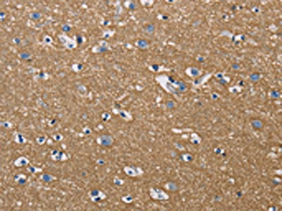 The image on the left is immunohistochemistry of paraffin-embedded Human brain tissue using CSB-PA223691(GPM6A Antibody) at dilution 1/50, on the right is treated with fusion protein. (Original magnification: ×200)