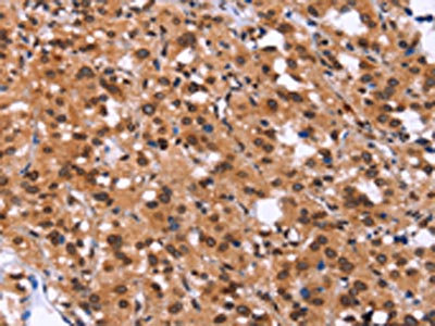 The image on the left is immunohistochemistry of paraffin-embedded Human gastric cancer tissue using CSB-PA585463(GPR124 Antibody) at dilution 1/40, on the right is treated with synthetic peptide. (Original magnification: ×200)