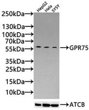 別名:G protein coupled receptor 75 antibody; GPR chr2 antibody; Gpr75 antibody; GPR75_HUMAN antibody; GPRchr2 antibody; OTTHUMP00000159608 antibody; Probable G protein coupled receptor 75 antibody; Probable G-protein coupled receptor 75 antibody; WI 31133 antibody; WI31133 antibody