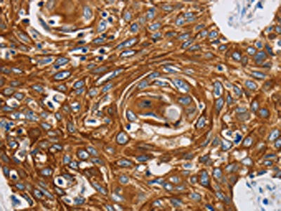 The image on the left is immunohistochemistry of paraffin-embedded Human esophagus cancer tissue using CSB-PA118272(GRIN1 Antibody) at dilution 1/45, on the right is treated with synthetic peptide. (Original magnification: ×200)
