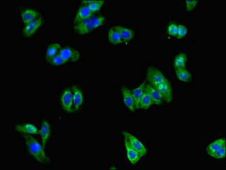 • Immunofluorescent analysis of HepG2 cells using CSB-PA009911LA01HU at dilution of 1:100 and Alexa Fluor 488-congugated AffiniPure Goat Anti-Rabbit IgG(H+L)