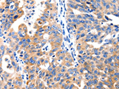 • The image on the left is immunohistochemistry of paraffin-embedded Human ovarian cancer tissue using CSB-PA559950(GRM1 Antibody) at dilution 1/10, on the right is treated with synthetic peptide. (Original magnification: ×200)