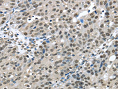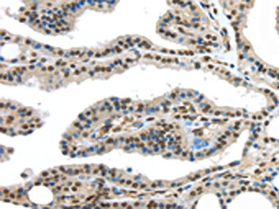 • The image on the left is immunohistochemistry of paraffin-embedded Human thyroid cancer tissue using CSB-PA192926(HDAC1 Antibody) at dilution 1/20, on the right is treated with fusion protein. (Original magnification: ×200)