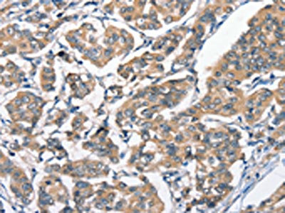 • The image on the left is immunohistochemistry of paraffin-embedded Human breast cancer tissue using CSB-PA221214(HGF Antibody) at dilution 1/65, on the right is treated with fusion protein. (Original magnification: ×200)