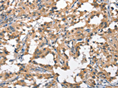 • The image on the left is immunohistochemistry of paraffin-embedded Human thyroid cancer tissue using CSB-PA221214(HGF Antibody) at dilution 1/65, on the right is treated with fusion protein. (Original magnification: ×200)