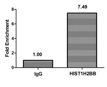 Chromatin Immunoprecipitation Hela (4*106) were treated with Micrococcal Nuclease, sonicated, and immunoprecipitated with 8µg anti-HIST1H2BB (CSB-PA010402OA16nacHU) or a control normal rabbit IgG. The resulting ChIP DNA was quantified using real-time PCR with primers against the β-Globin promoter.