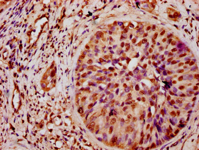 IHC image of CSB-PA010418OA09nbutHU diluted at 1:5 and staining in paraffin-embedded human cervical cancer performed on a Leica BondTM system. After dewaxing and hydration, antigen retrieval was mediated by high pressure in a citrate buffer (pH 6.0). Section was blocked with 10% normal goat serum 30min at RT. Then primary antibody (1% BSA) was incubated at 4°C overnight. The primary is detected by a biotinylated secondary antibody and visualized using an HRP conjugated SP system.