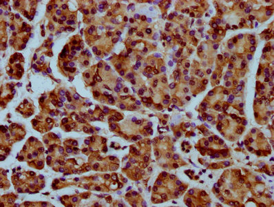 IHC image of CSB-PA010429OA35nme1HU diluted at 1:25 and staining in paraffin-embedded human pancreatic cancer performed on a Leica BondTM system. After dewaxing and hydration, antigen retrieval was mediated by high pressure in a citrate buffer (pH 6.0). Section was blocked with 10% normal goat serum 30min at RT. Then primary antibody (1% BSA) was incubated at 4°C overnight. The primary is detected by a biotinylated secondary antibody and visualized using an HRP conjugated SP system.