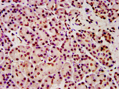 IHC image of CSB-PA010429OA05npropHU diluted at 1:5 and staining in paraffin-embedded human pancreatic tissue performed on a Leica BondTM system. After dewaxing and hydration, antigen retrieval was mediated by high pressure in a citrate buffer (pH 6.0). Section was blocked with 10% normal goat serum 30min at RT. Then primary antibody (1% BSA) was incubated at 4°C overnight. The primary is detected by a biotinylated secondary antibody and visualized using an HRP conjugated SP system.