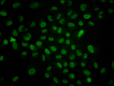 Immunofluorescence staining of Hela cells with CSB-PA010429OA91npropHU at 1:1.25, counter-stained with DAPI. The cells were fixed in 4% formaldehyde, permeabilized using 0.2% Triton X-100 and blocked in 10% normal Goat Serum. The cells were then incubated with the antibody overnight at 4°C. The secondary antibody was Alexa Fluor 488-congugated AffiniPure Goat Anti-Rabbit IgG(H+L).