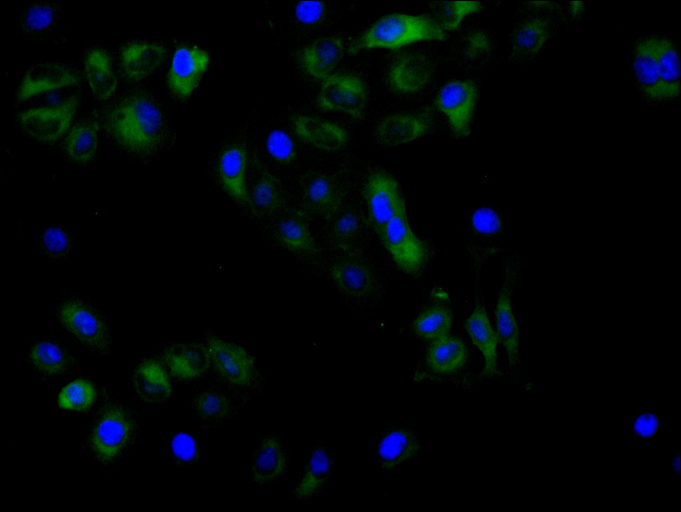 Immunofluorescence staining of Hela cell with CSB-PA15099A0Rb at 1:80, counter-stained with DAPI. The cells were fixed in 4% formaldehyde and blocked in 10% normal Goat Serum. The cells were then incubated with the antibody overnight at 4C. The secondary antibody was Alexa Fluor 488-congugated AffiniPure Goat Anti-Rabbit IgG(H+L).