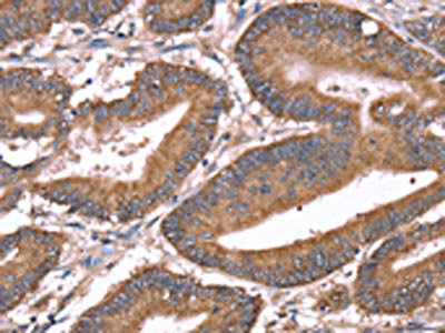 The image on the left is immunohistochemistry of paraffin-embedded Human colon cancer tissue using CSB-PA589788(HRG Antibody) at dilution 1/50, on the right is treated with synthetic peptide. (Original magnification: ×200)